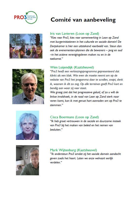 Pro3 is een politieke partij met een progressief, sociaal en groen programma, die staat voor gelijke kansen en onderlinge solidariteit en die samen met inwoners werkt aan een duurzame samenleving.